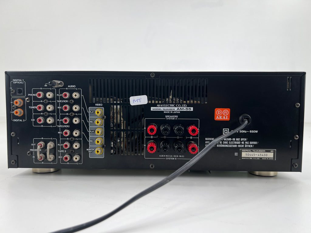 Opvallende kenmerken zijn onder andere een dempingsfactor van 45, wat de luidsprekercontrole verbetert, en een ingangsgevoeligheid van 2,5 mV (MM) en 150 mV (lijn), waardoor diverse audiobronnen kunnen worden aangesloten. De versterker heeft een uitstekende signaal-ruisverhouding van 85 dB (MM) en 102 dB (lijn), wat zorgt voor minimale interferentie. Bovendien wordt de veelzijdigheid vergroot door digitale ingangen zoals coaxiaal en optisch, waarmee aan de moderne aansluitbehoeften wordt voldaan. De combinatie van vermogen, precisie en aanpasbaarheid van de Akai AM-55 bevestigt zijn status als een opvallende vintage versterker in de audiowereld.