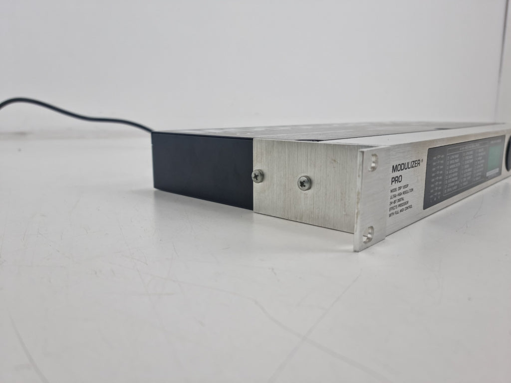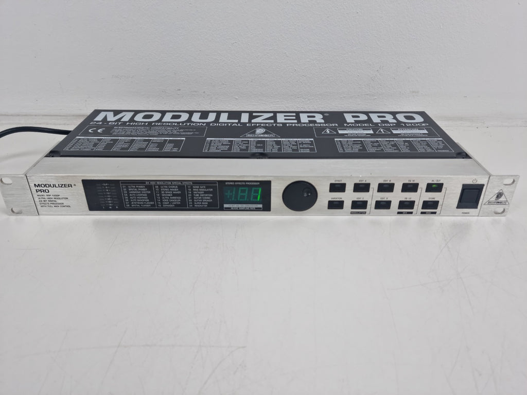 Condition:In new condition - The Behringer MODULIZER PRO DSP1200P is a 24-bit/46kHz stereo digital multi-effects processor, featuring 100 user presets and 20-bit A/D-D/A converters, designed for studio and live applications in a 1U rackmount format. It specializes in modulation, spatial, and dynamics effects, including ring modulation, 3D processing, and distortion.
