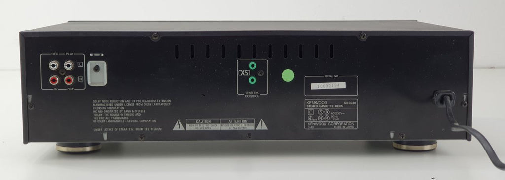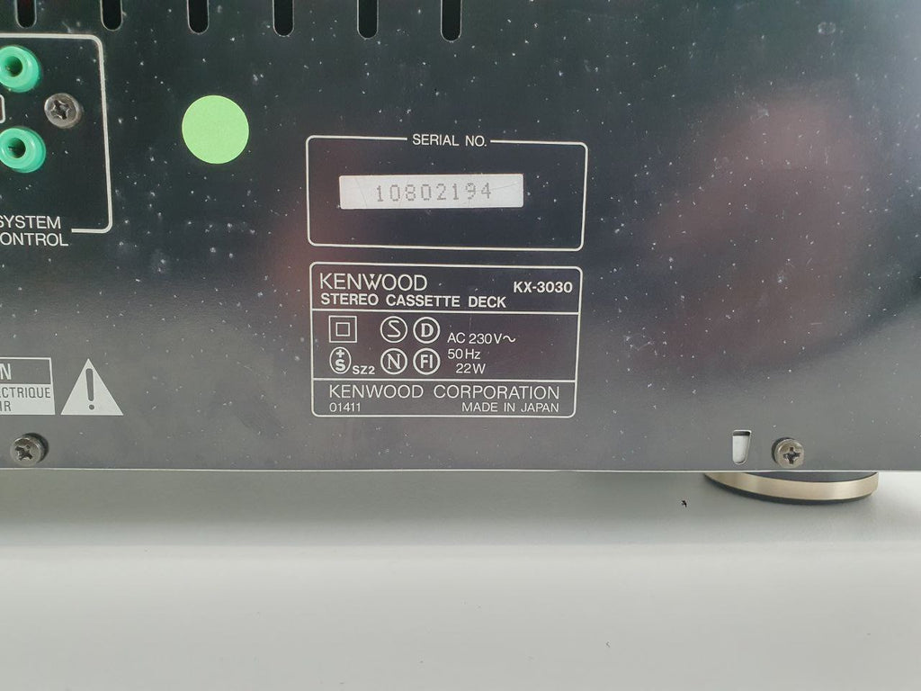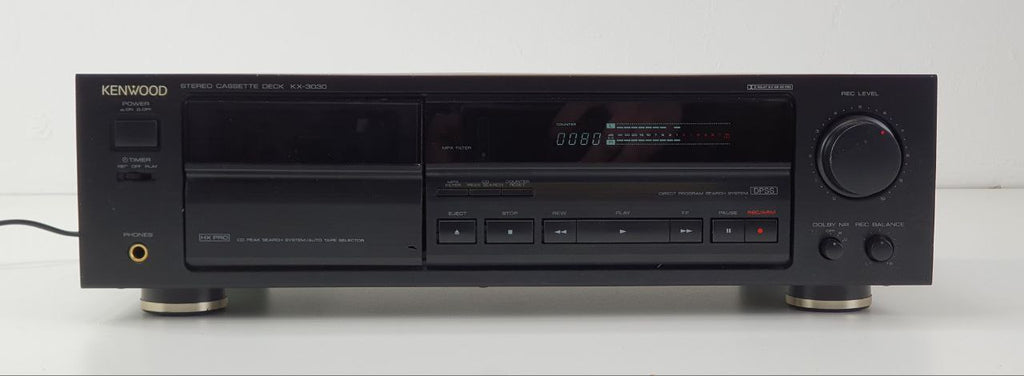 Met een frequentiebereik van 20 Hz tot 18 kHz (Metal tape) levert de KX-3030 een rijke en gedetailleerde geluidsweergave. Opvallende kenmerken zijn onder andere een signaal-ruisverhouding van 73 dB (Dolby C), een indrukwekkende wow- en flutterwaarde van 0,05% en een totale harmonische vervorming van 0,8%. De robuuste ingangs- en uitgangsspecificaties (77,5 mV lijningang, 0,49 V lijnuitgang) bevestigen de positie van het apparaat als een hoogwaardig cassettedeck. De strakke zwarte afwerking geeft het ontwerp een verfijnde uitstraling en belichaamt de essentie van de audiotechniek uit de vroege jaren '90.