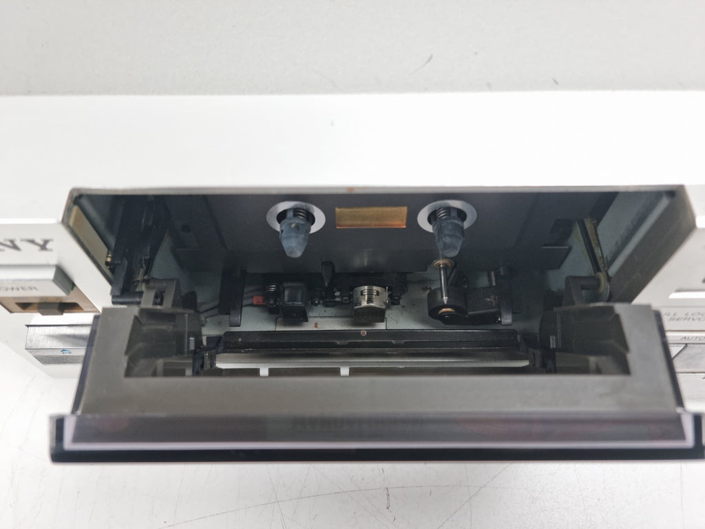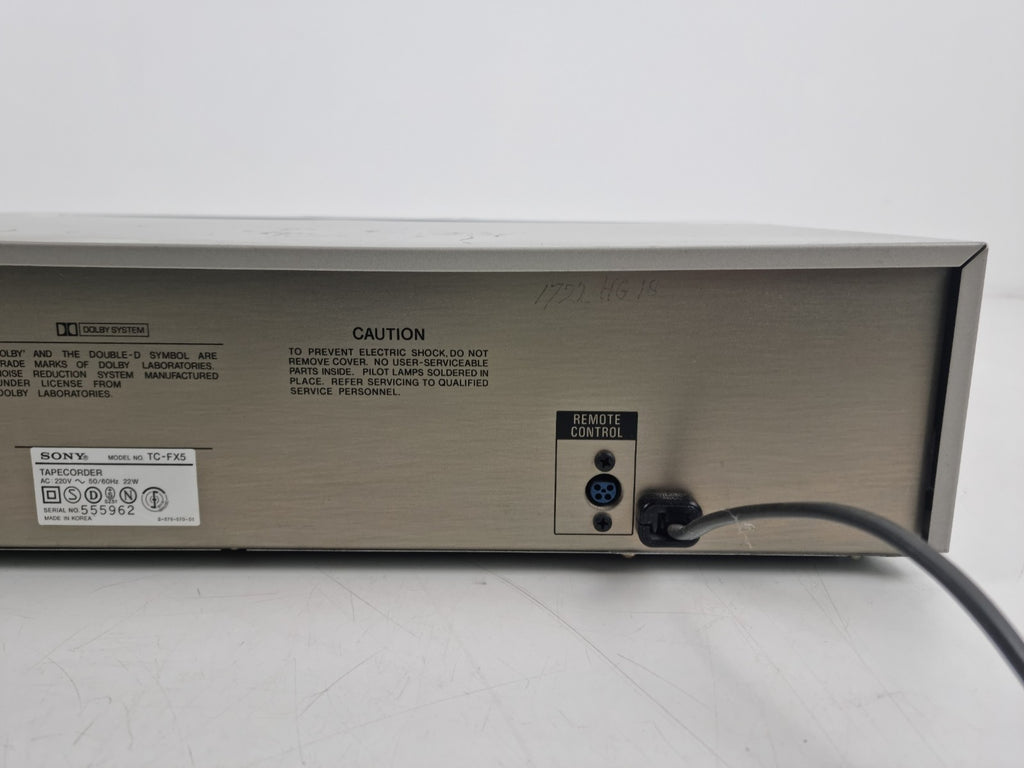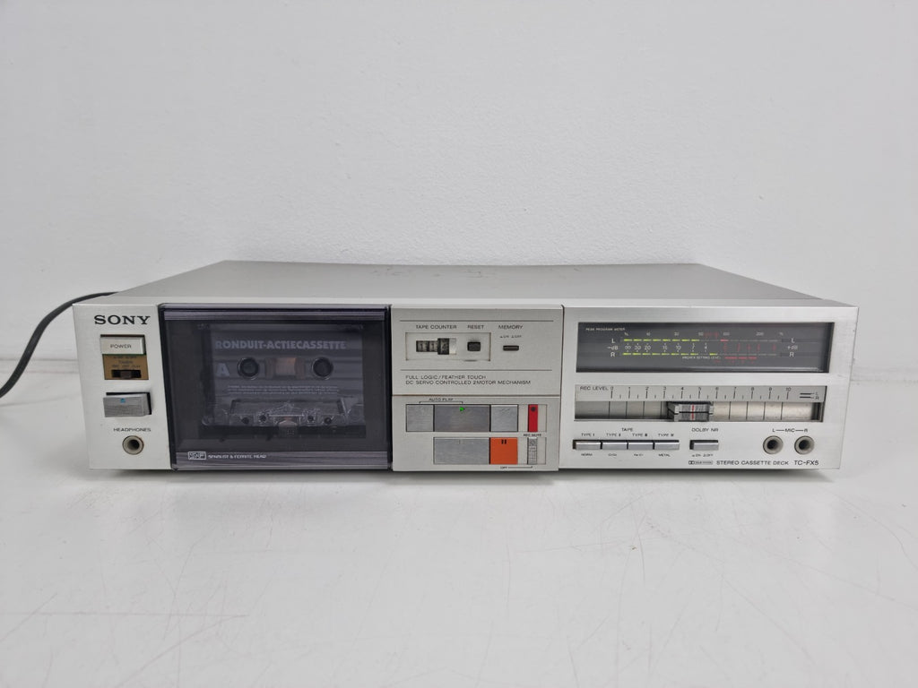 Condition: Tested and potentiometer cleaned. The Sony TC-FX5, introduced by Sony in 1981 and discontinued in 1984, features Dolby B noise reduction. Its notable features include dual heads, a mechanical 3-digit tape counter with memory stop, and manual tape type selection catering to normal, chrome, ferro-chrome, and metal tapes.
