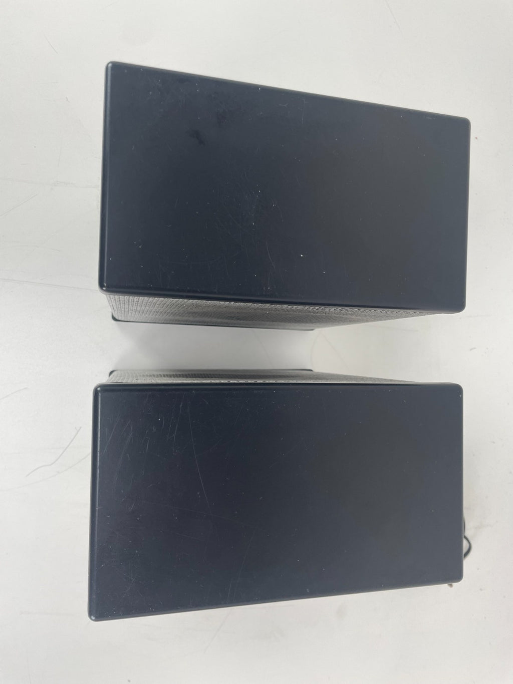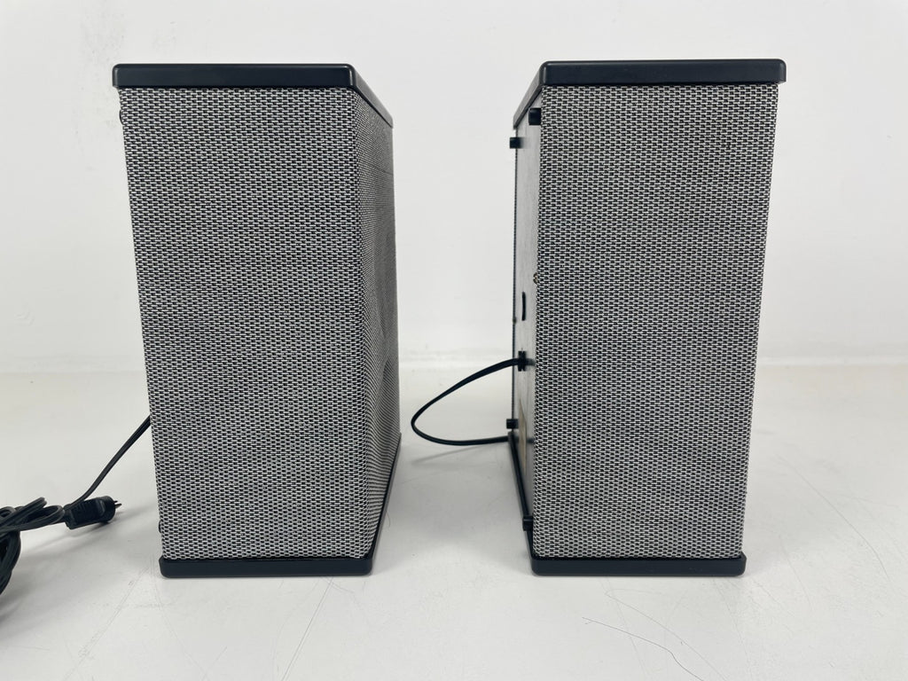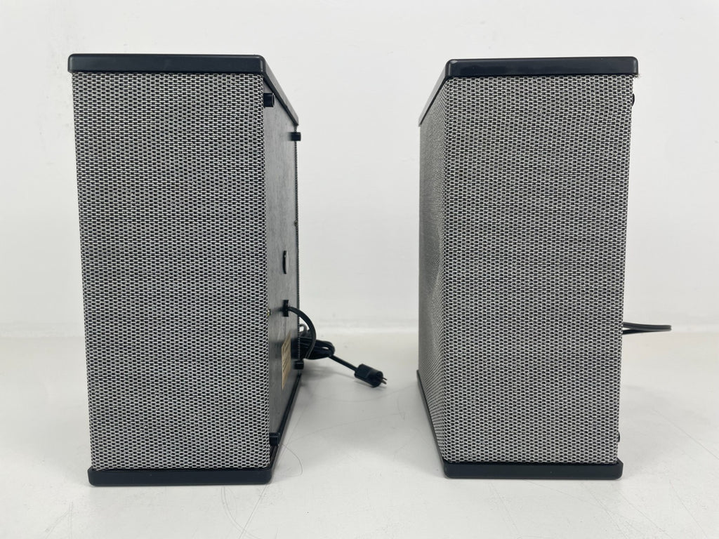 Het frontrooster is licht gedeukt en vertoont lichte gebruikssporen, maar over het algemeen zijn de luidsprekers schoon en in goede staat.