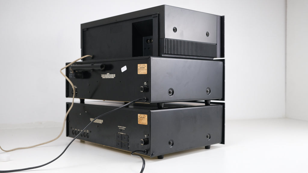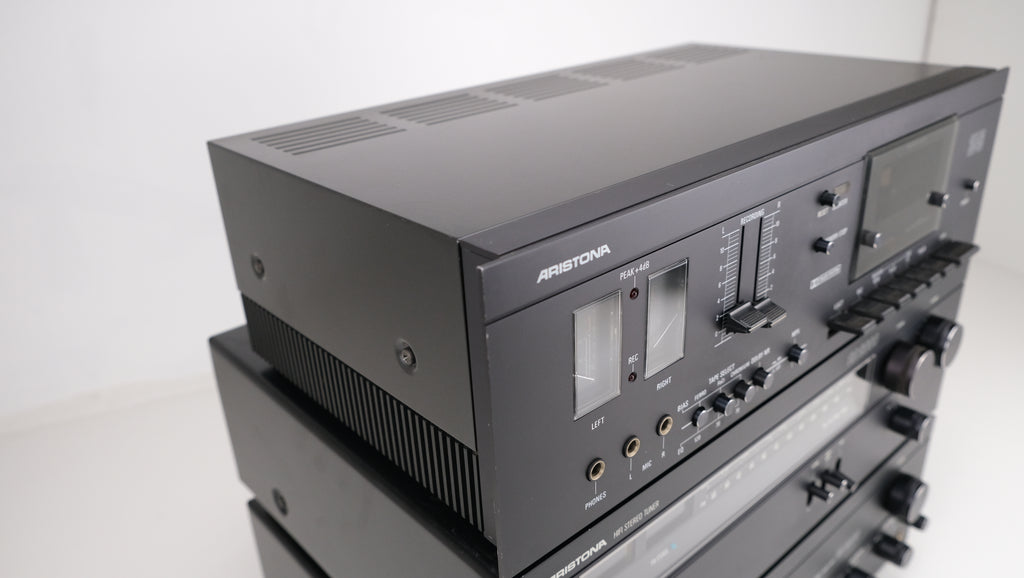 The vintage Aristona EK3543 Cassette Deck, introduced in 1980, offers exceptional audio performance and versatility. Equipped with Dolby B noise reduction, it significantly reduces tape hiss for pristine sound quality, particularly notable in its handling of normal, chrome, and ferro-chrome tapes. Its two-head design, along with a belt-driven single-capstan transport system, ensures accurate playback and recording. The inclusion of a mechanical 3-digit tape counter with memory stop simplifies navigation and precise positioning on the tape. Additionally, its switchable MPX filter effectively eliminates false triggering from FM stereo broadcasts, enhancing Dolby processing. With its robust construction and comprehensive connectivity options, including mono microphone inputs and RCA connectors, the Aristona EK3543 remains a coveted choice for audiophiles seeking reliable vintage cassette playback.