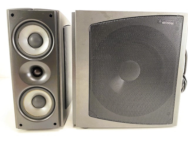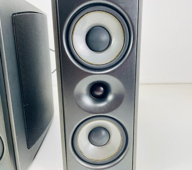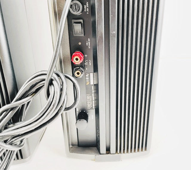 Condition: Tested and working. Fuses replaced. The front grills are a bit loose and need to be taped to stay in place. One speaker is missing the rubber foot and grille fabric is slightly torn at the bottom. See pictures for more detail. (our new camere has some setting issues at the moment hence the stange color)