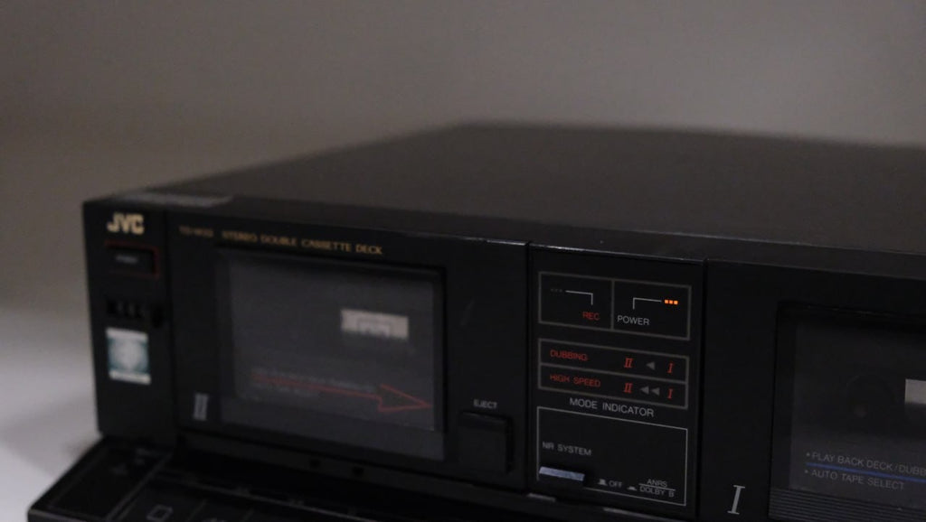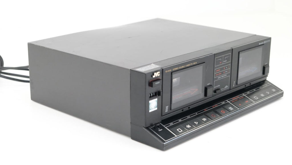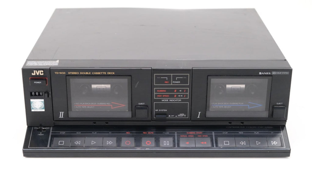 The JVC TD-W33 stands out as a stereo double cassette deck featuring Dolby B noise reduction technology. Offering versatility, the TD-W33 supports normal, chrome, and metal tapes through its tape type selection feature. As a front-loading double cassette deck, it employs a mechanical tape eject system, requiring the cassette to be positioned with the playback side facing forward in the cassette well.