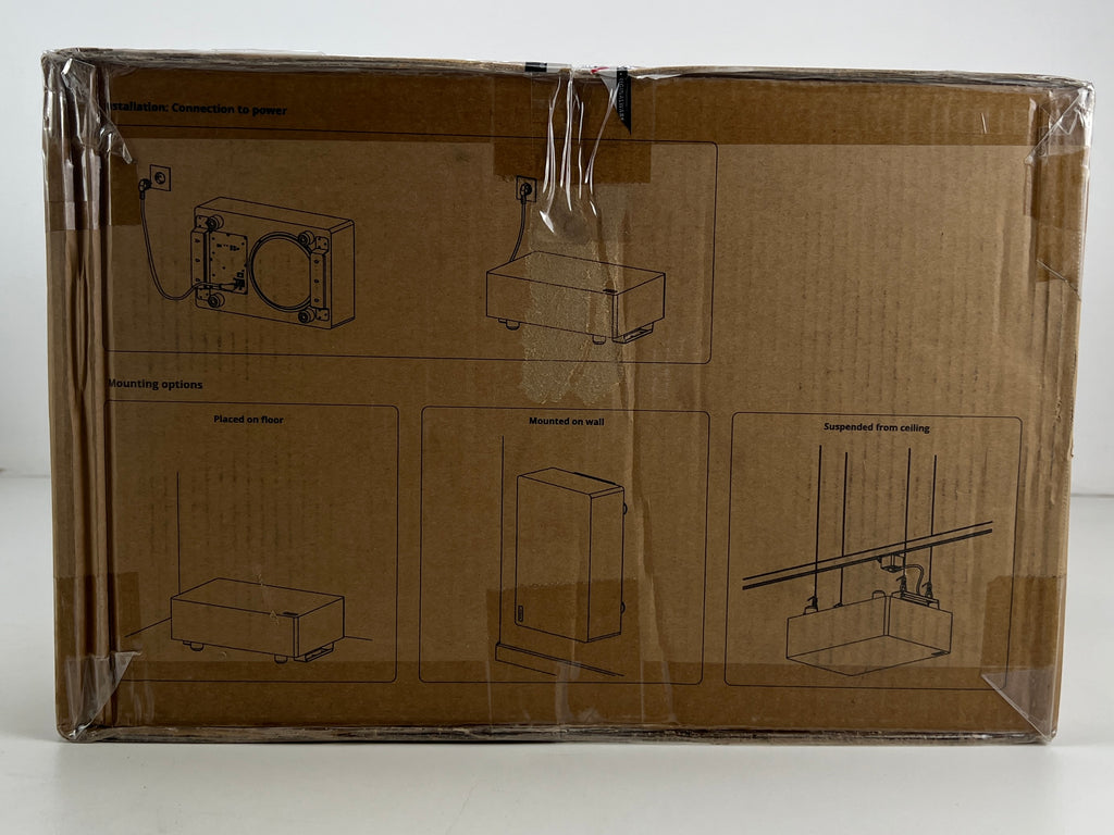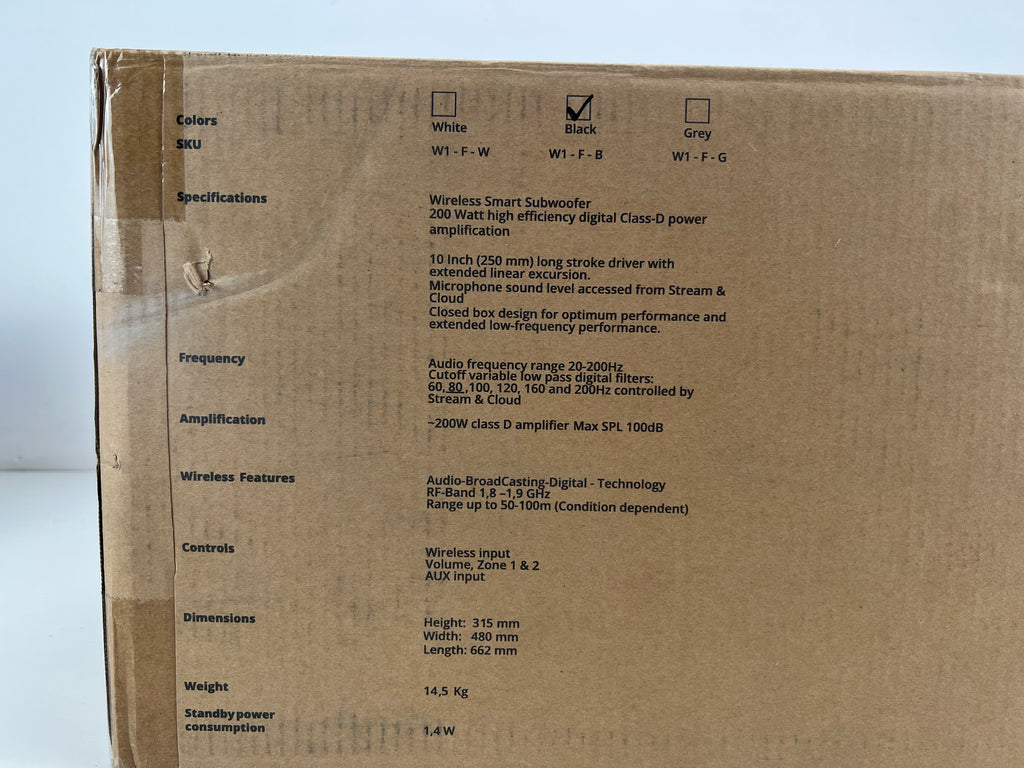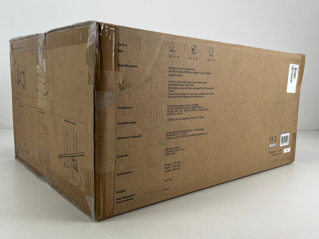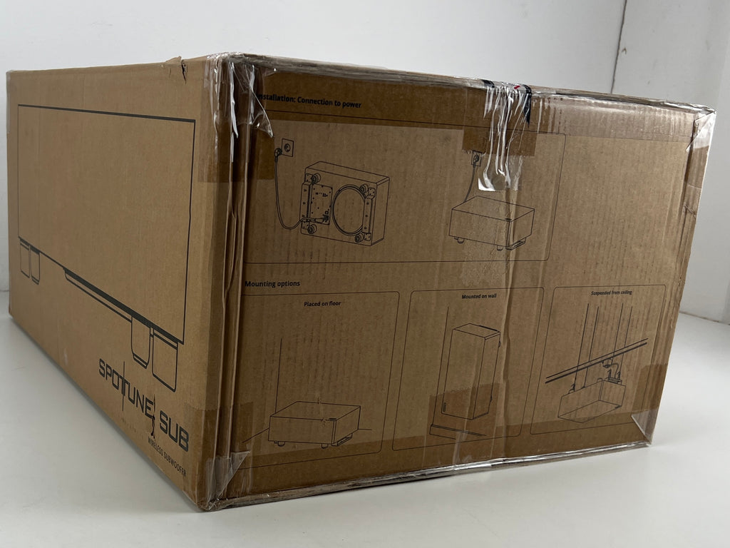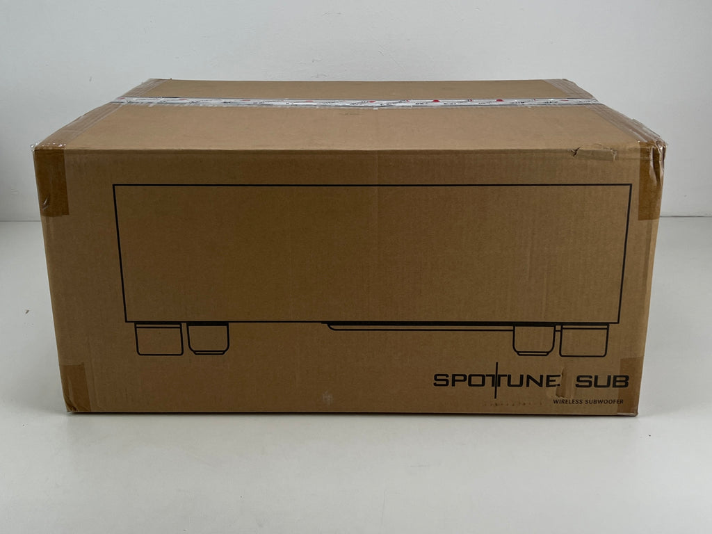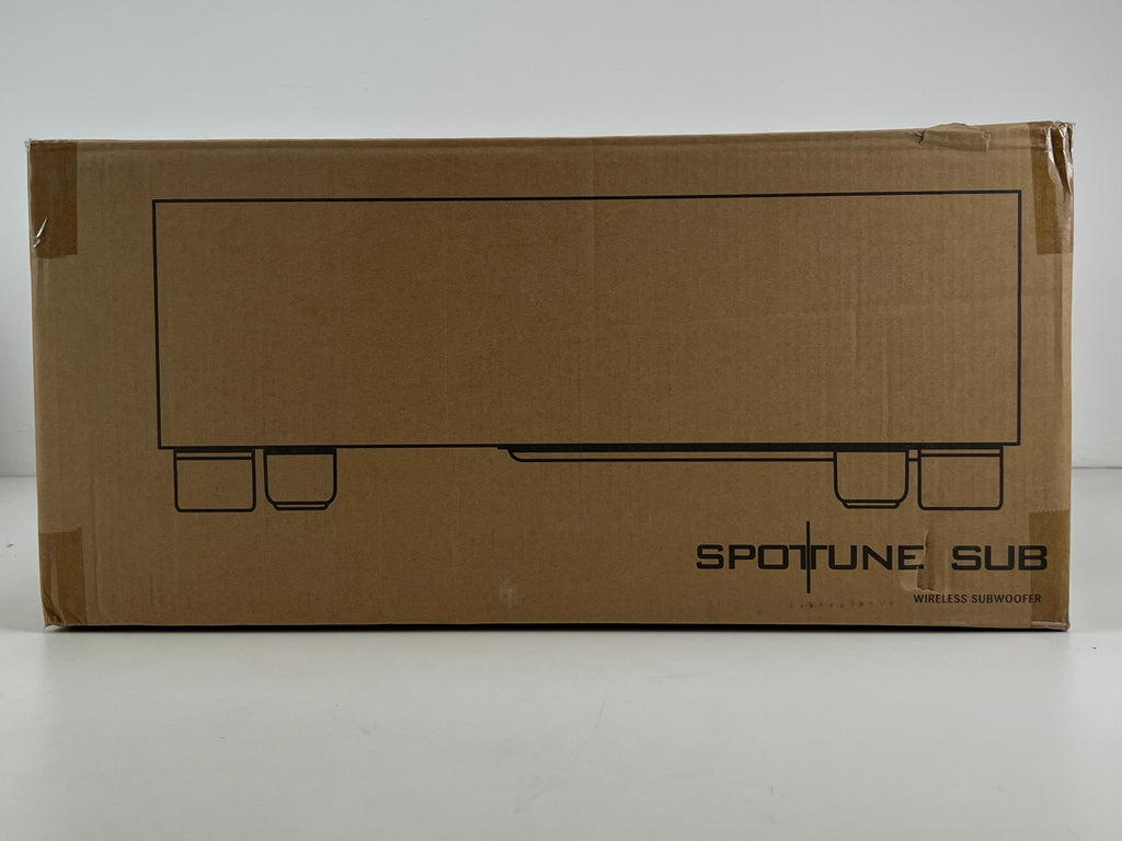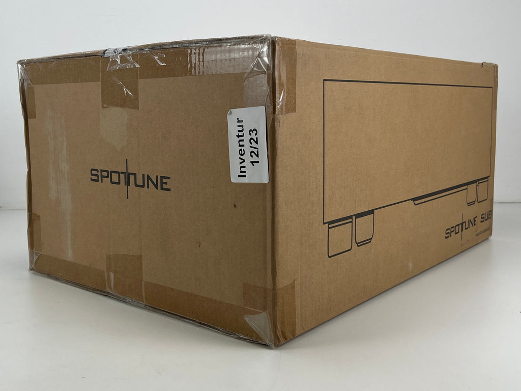 The Spottune Subwoofer - Black (W1FB) is a wireless smart subwoofer designed to complement the Spottune Omni speakers, enhancing bass and low-frequency performance. With a 10-inch long-stroke driver and 200 Watt high-efficiency digital Class-D power amplification, it delivers powerful and clear bass. Its closed-box design optimizes performance and extends low-frequency response. Additionally, it features variable low-pass digital filters with cutoff frequencies ranging from 60Hz to 200Hz, allowing for customizable audio output. With wireless capabilities utilizing Audio-Broadcasting-Digital technology, it offers flexibility in placement within a range of up to 50-100m. Controls include wireless input, volume adjustment for two zones, and an AUX input.